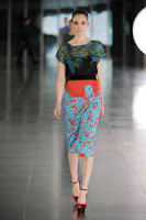 Key items: Flare-skirted skater dresses were young and flirty in either printed silks and chiffons or weightier structured wools. Swishy skater miniskirts were teamed with printed silk pussybow blouses, while a full-skirted tailored redingote followed the same flared silhouette. The contrasting lines of lean column dresses had a 70s jet-set vibe - some long-sleeved with gathered details, others featuring daring plunge necklines, thigh-high splits or cutaway backs. Separates included fluid silk wide-leg pants, maxiskirts with second-skin polo-neck tops and skin-tight flat-front Capri pants topped with a cropped mink jacket. “It was a print revival - I recycled all my old prints,” said Daniella Helayel. “I went into my archive and looked at everything I’ve done over the last 10 years and created this firework print which was an explosion of all the elements.”