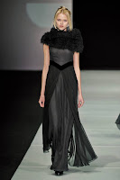 Maybe it was the upcoming Oscars that turned Giorgio Armani’s thoughts to the world of cinematic references, in particular the genre of film noir, but it was a brave move in a season full of technicolour to send out a collection based almost entirely on a chiaroscuro of blacks.